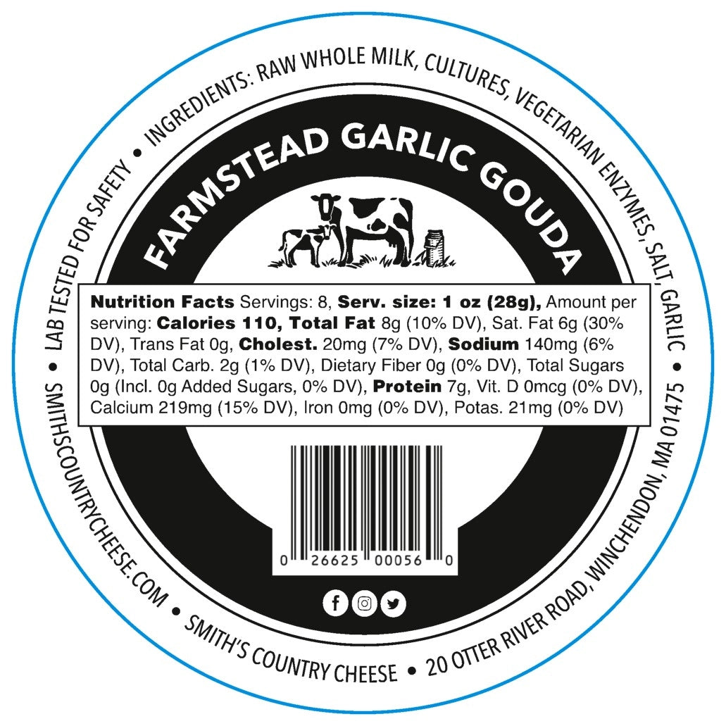 A true fan-favorite! If you like garlic and cheese, this is the Gouda for you! Our creamy Gouda cheese is blended with garlic and it's amazing melted in mac n' cheese, on a burger, or just paired with a cracker!